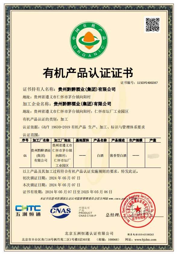 5月7日,黔醉酒業(yè)榮獲有機產品認證證書。這一重大成就標志著黔醉酒業(yè)在產品質量和管理方面的不懈努力獲得了權威官方認可。有機產品認證是對產品生產過程和質量的嚴格把關,只有符合國家認證標準的企業(yè)才能獲得有機產品認證。